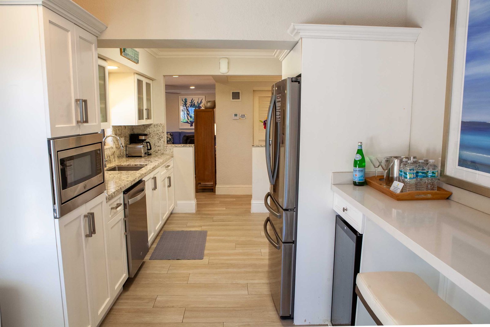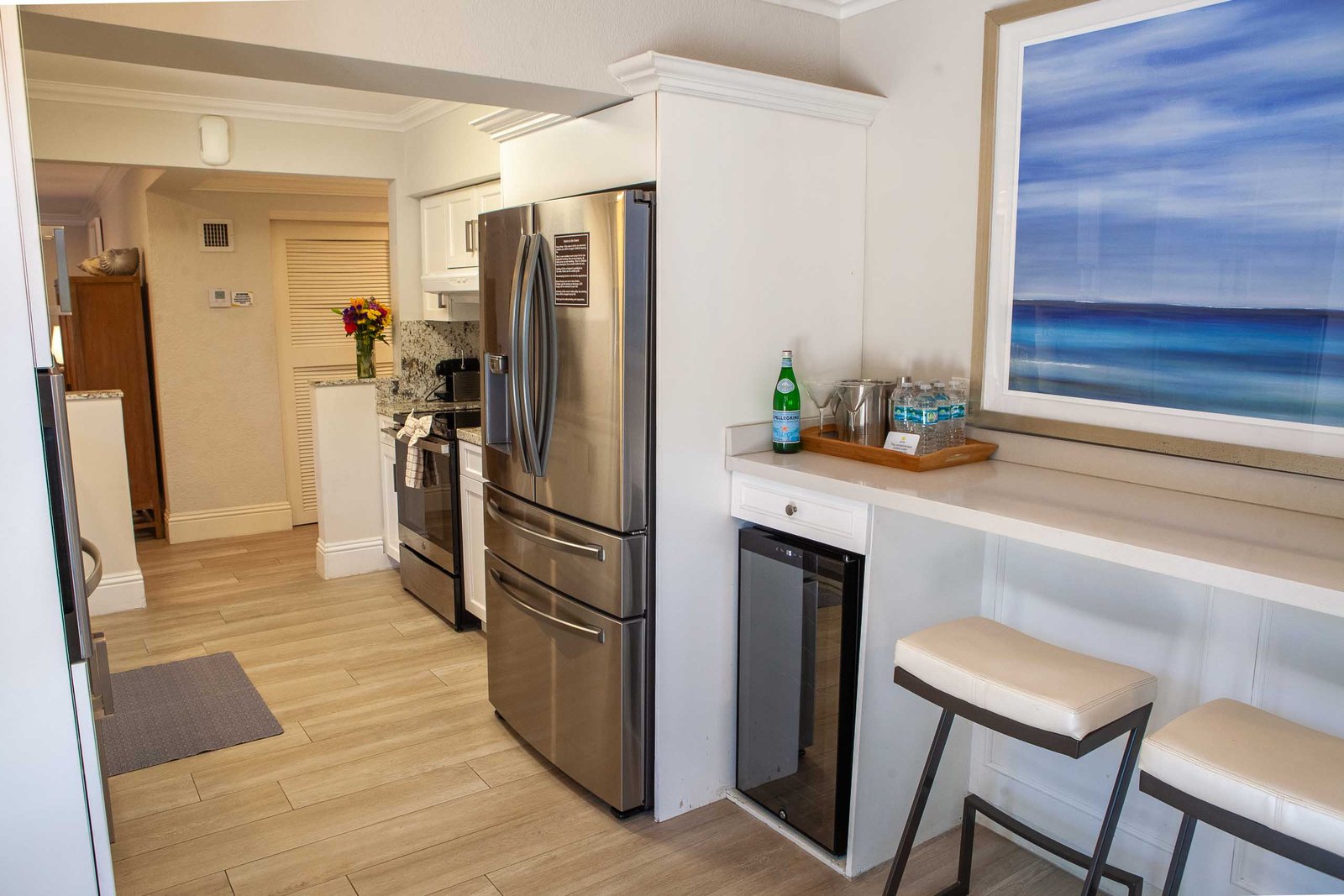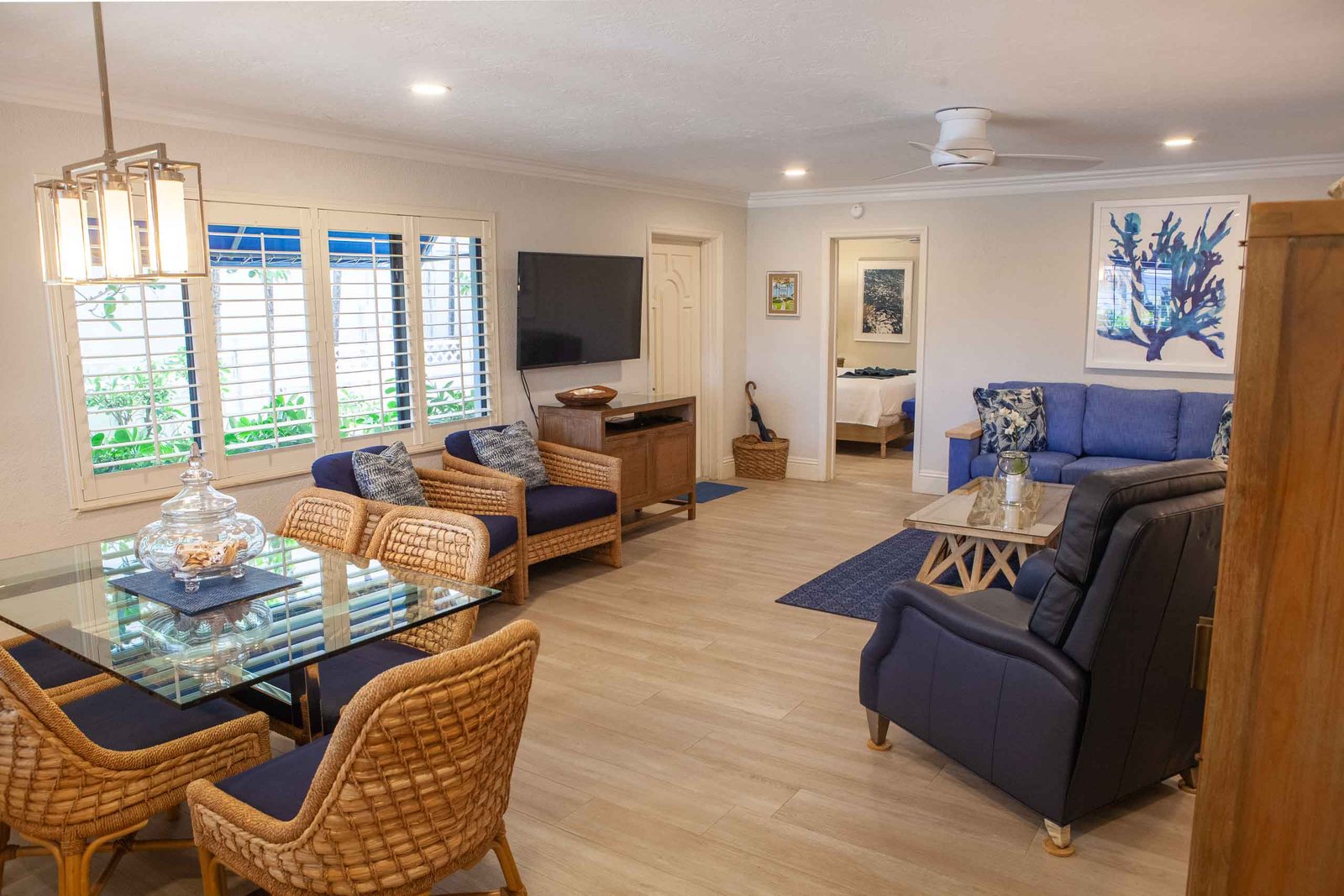 Our newly renovated Beach House is as private as it gets. Enjoy two spacious bedrooms, each with a king bed and private fully appointed baths, one with its own Jacuzzi tub and shower. There is a large living room with a queen sleeper sofa and a half bath. A fully equipped kitchen and a separate dining area offers a beautiful view of the beach side garden and the Atlantic ocean. A set of French doors lead out to the grand terrace patio with a large tiki hut and barbeque area with views of the coastline and the famous Lauderdale-by-the-Sea pier, looking north to the Hillsboro Lighthouse.