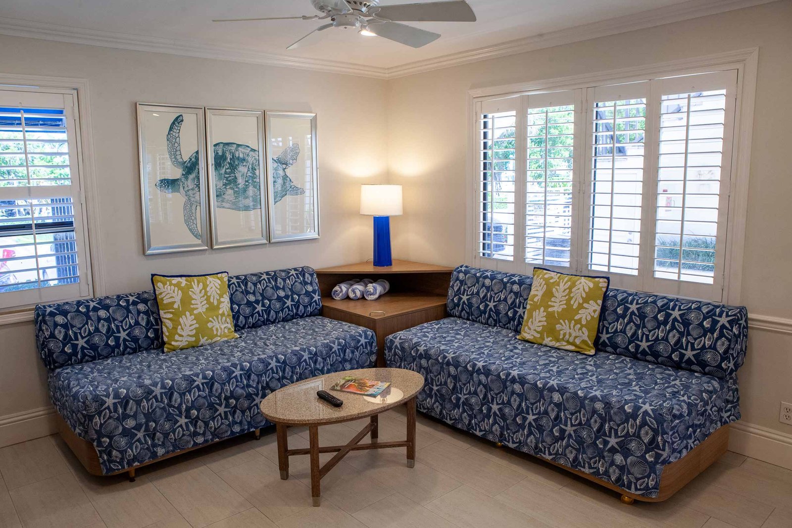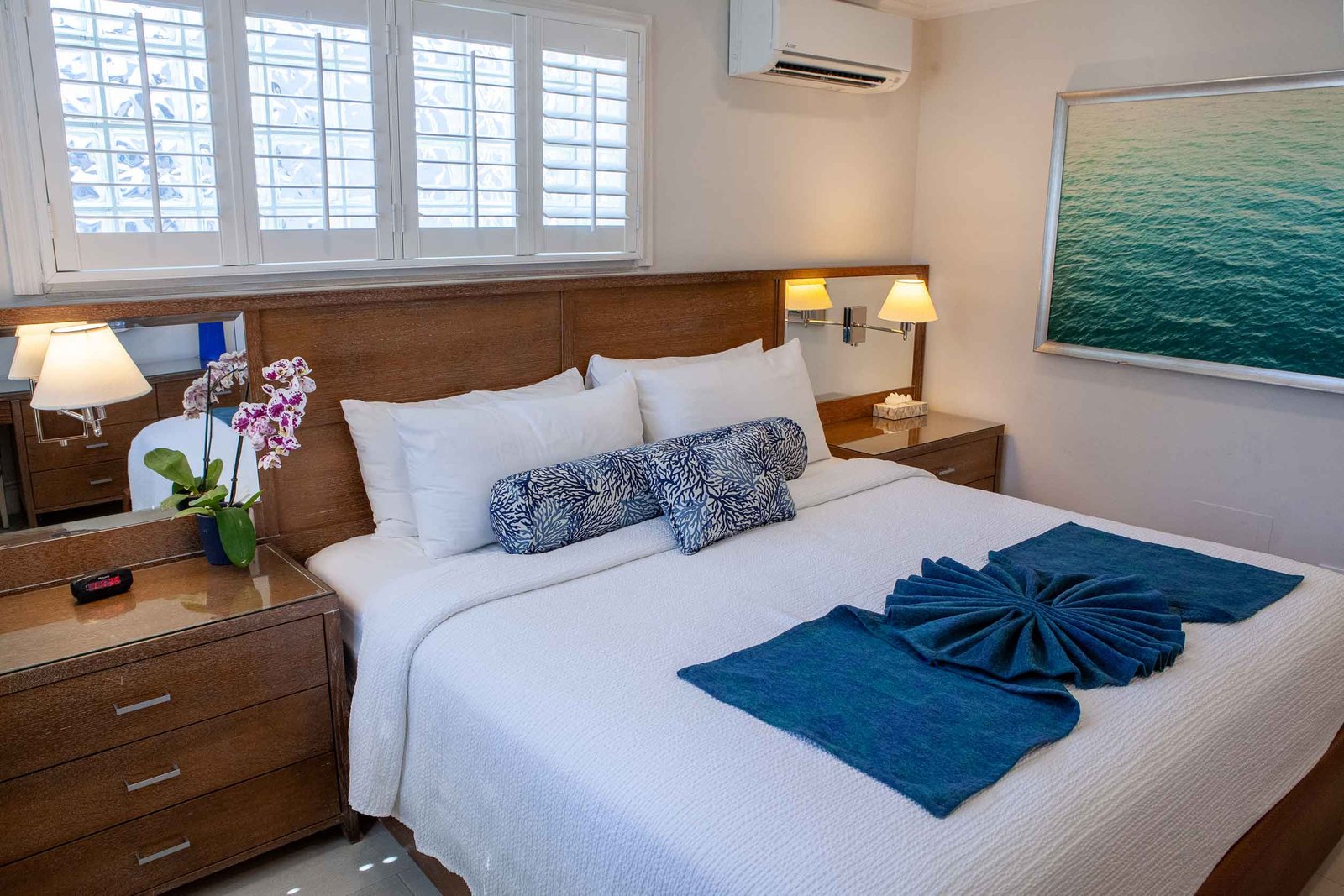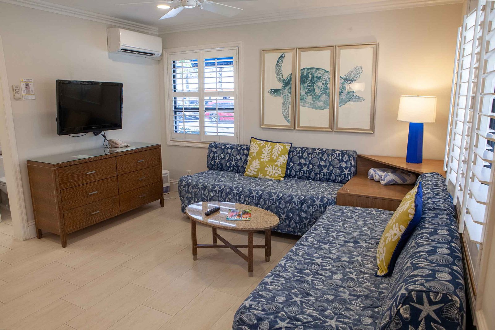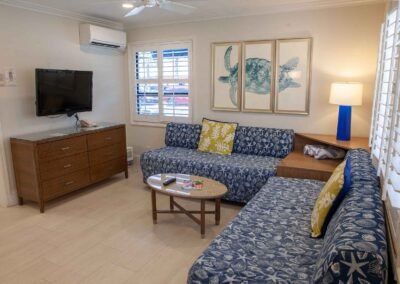 Our spacious One Bedroom Suites in The Sea Foam are some of our most popular rooms. They each have a separate bedroom with a king size bed and bath. The living room has two Bahama beds*, kitchen with dining area and a second bath.