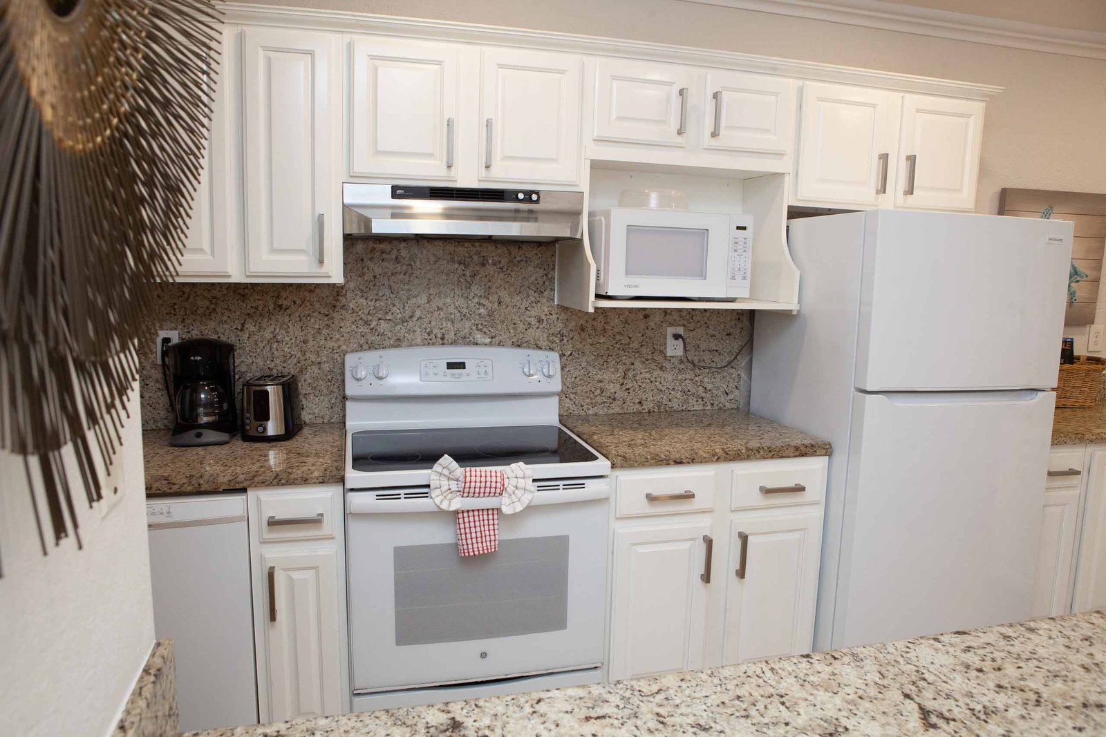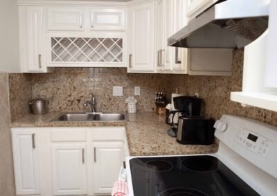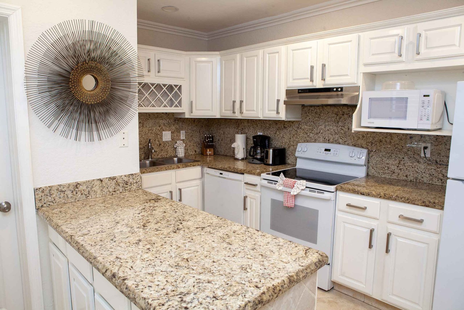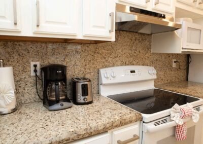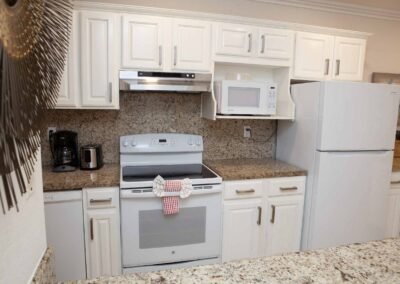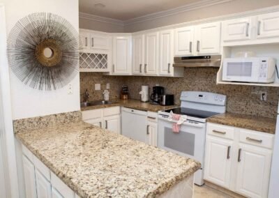 Apartment number 23 in The Nautilus has two separate bedrooms one with a king bed and the other with a queen bed. There is a queen sleeper sofa in the living room and a full kitchen with dishwasher and separate dining area and two full baths.