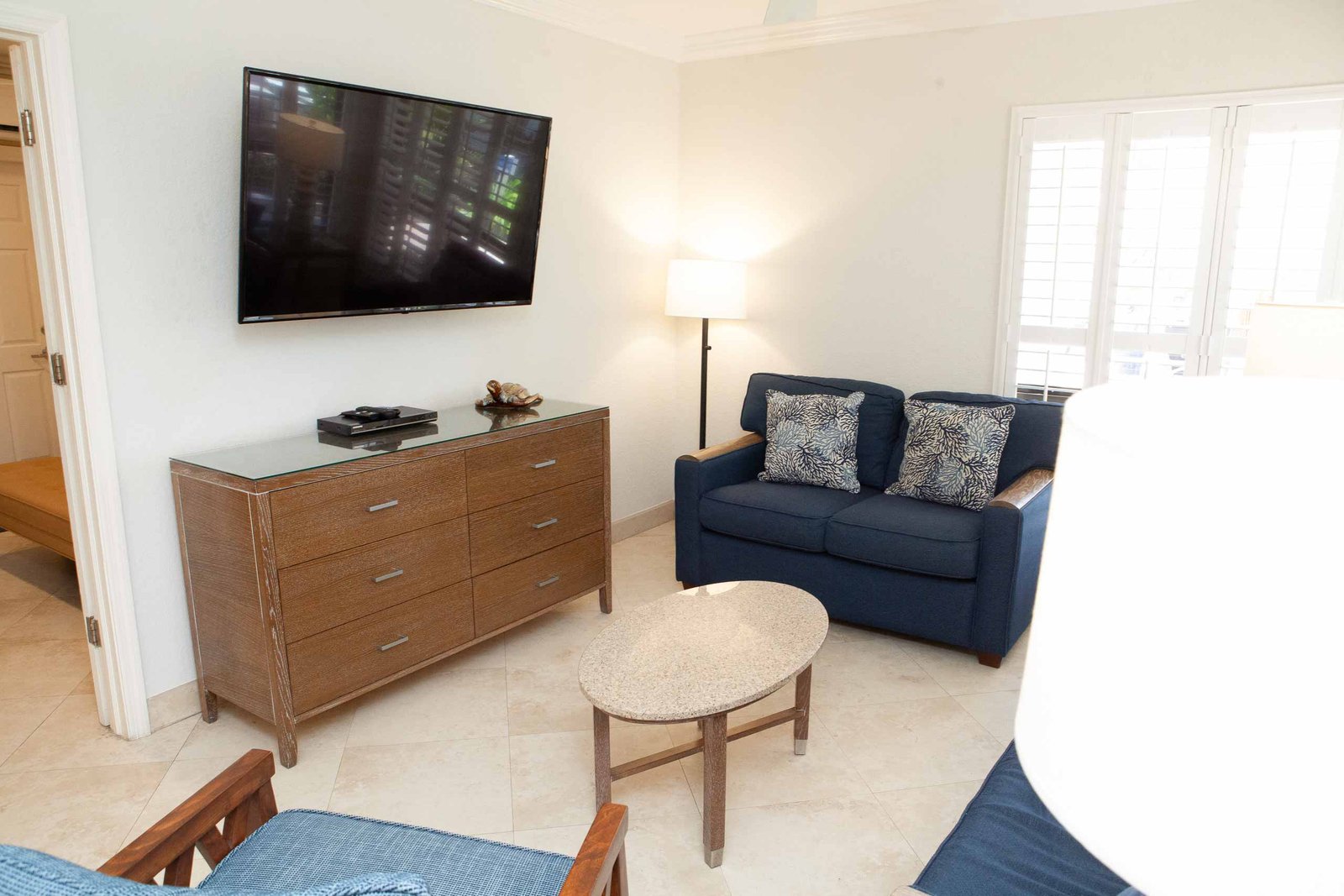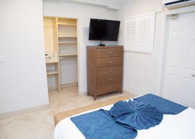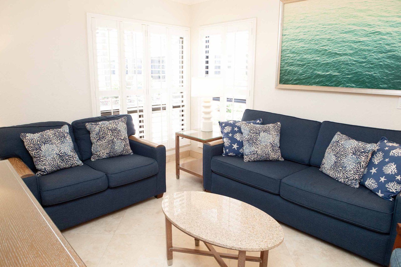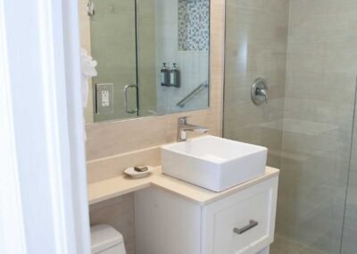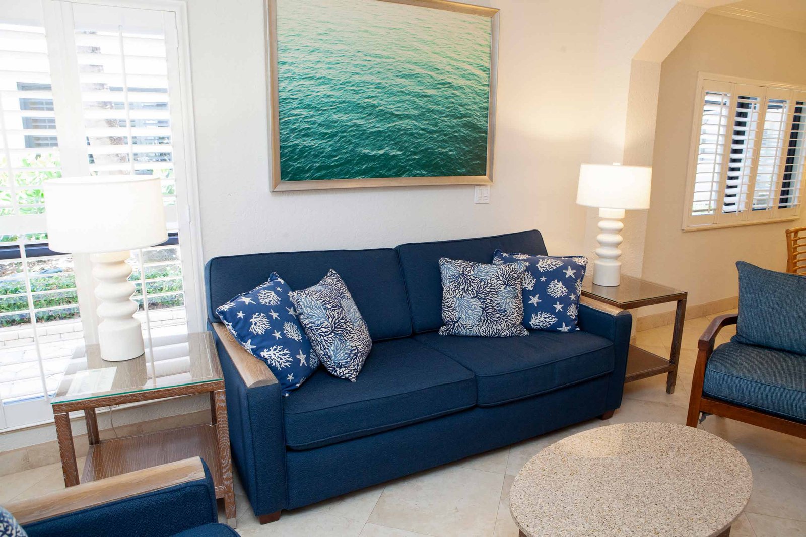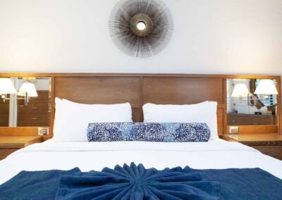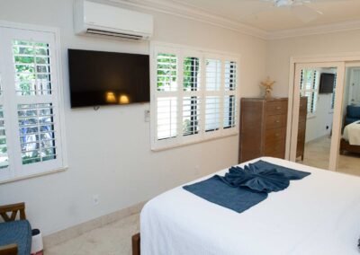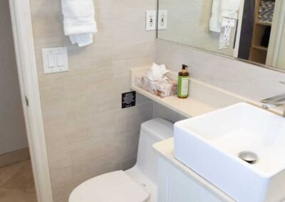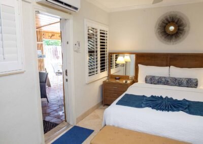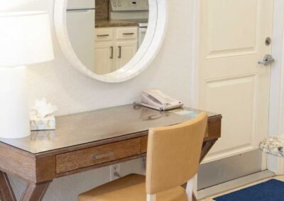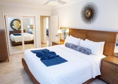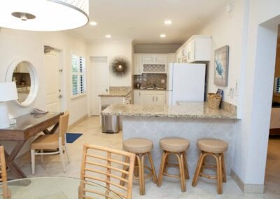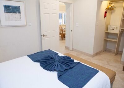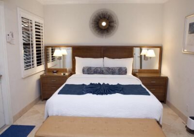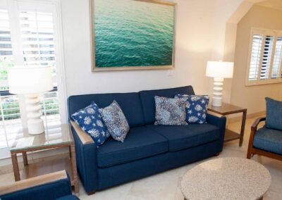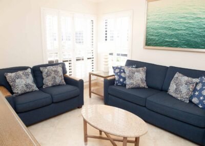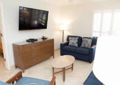 The other option is The Sea Foam Two-Bedroom Suites, which consist of a One-Bedroom Suite, connecting to a Hotel Room. There is a king bed in the bedroom with two Bahama beds* in the living room with an additional king bed in the Hotel Room. There is an additional king or queen bed in the Hotel room and a total of three full baths in this combination. Each sleeping area has its own flat screen TV as well as the living room, making this a great space for larger families or groups to share.