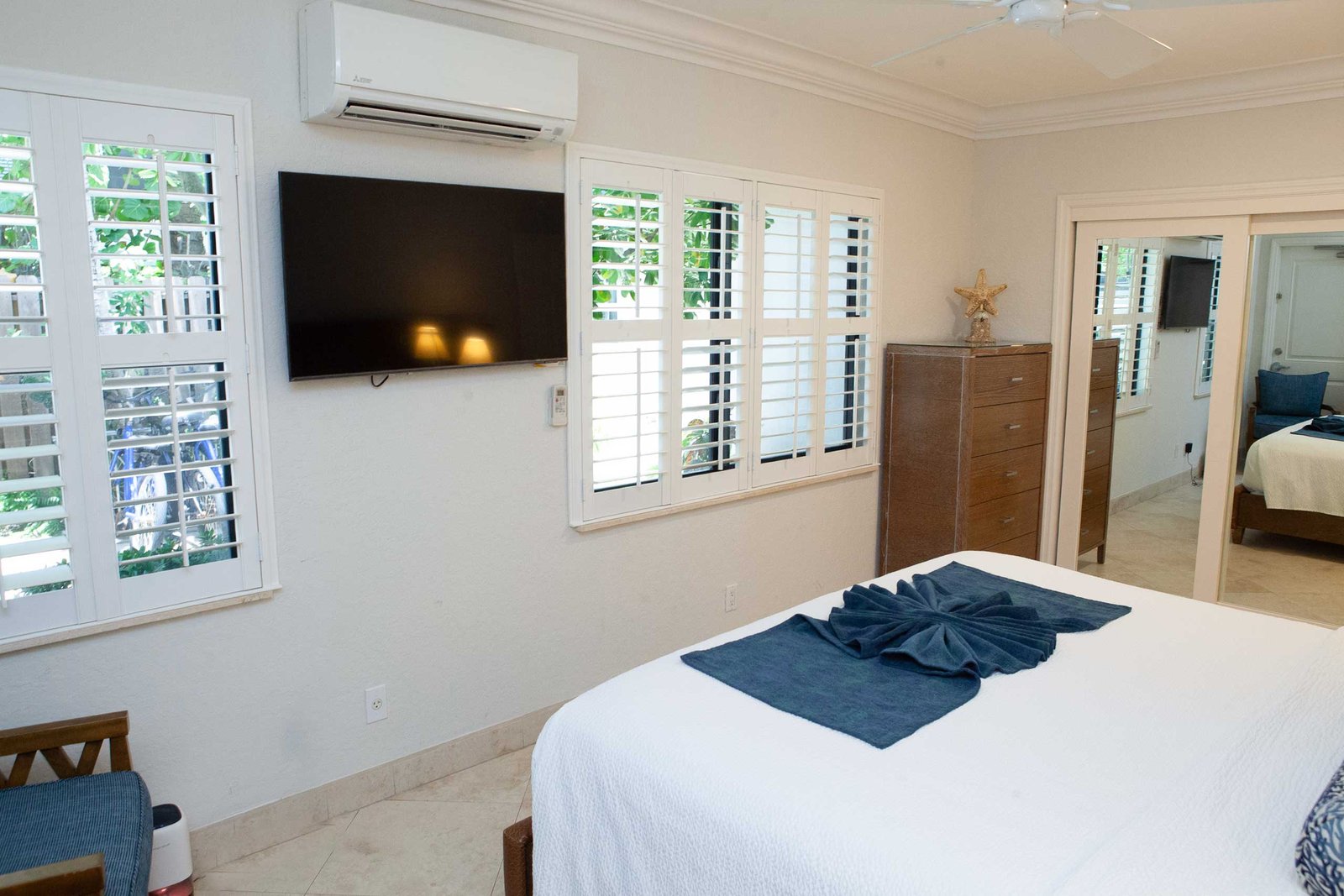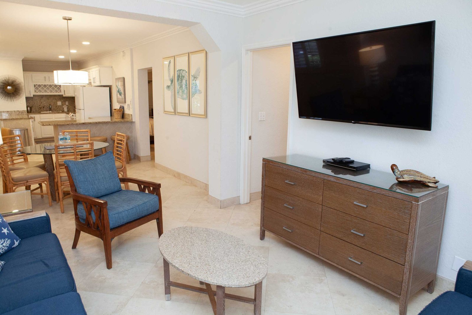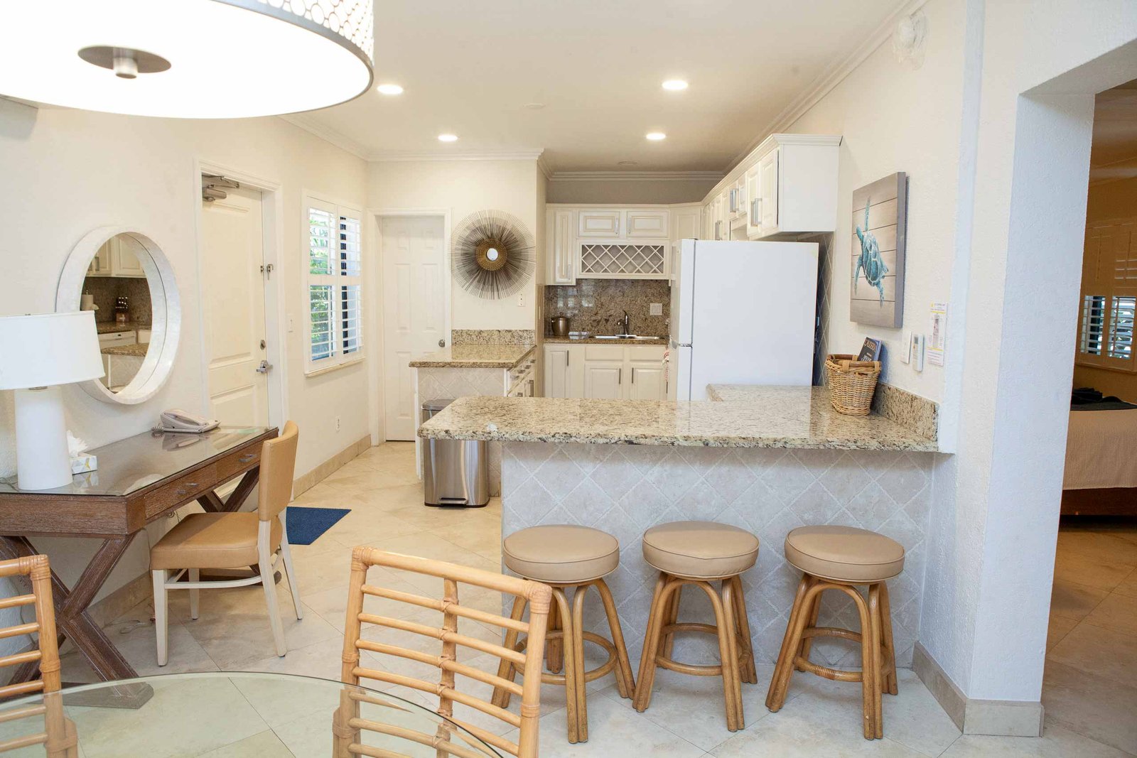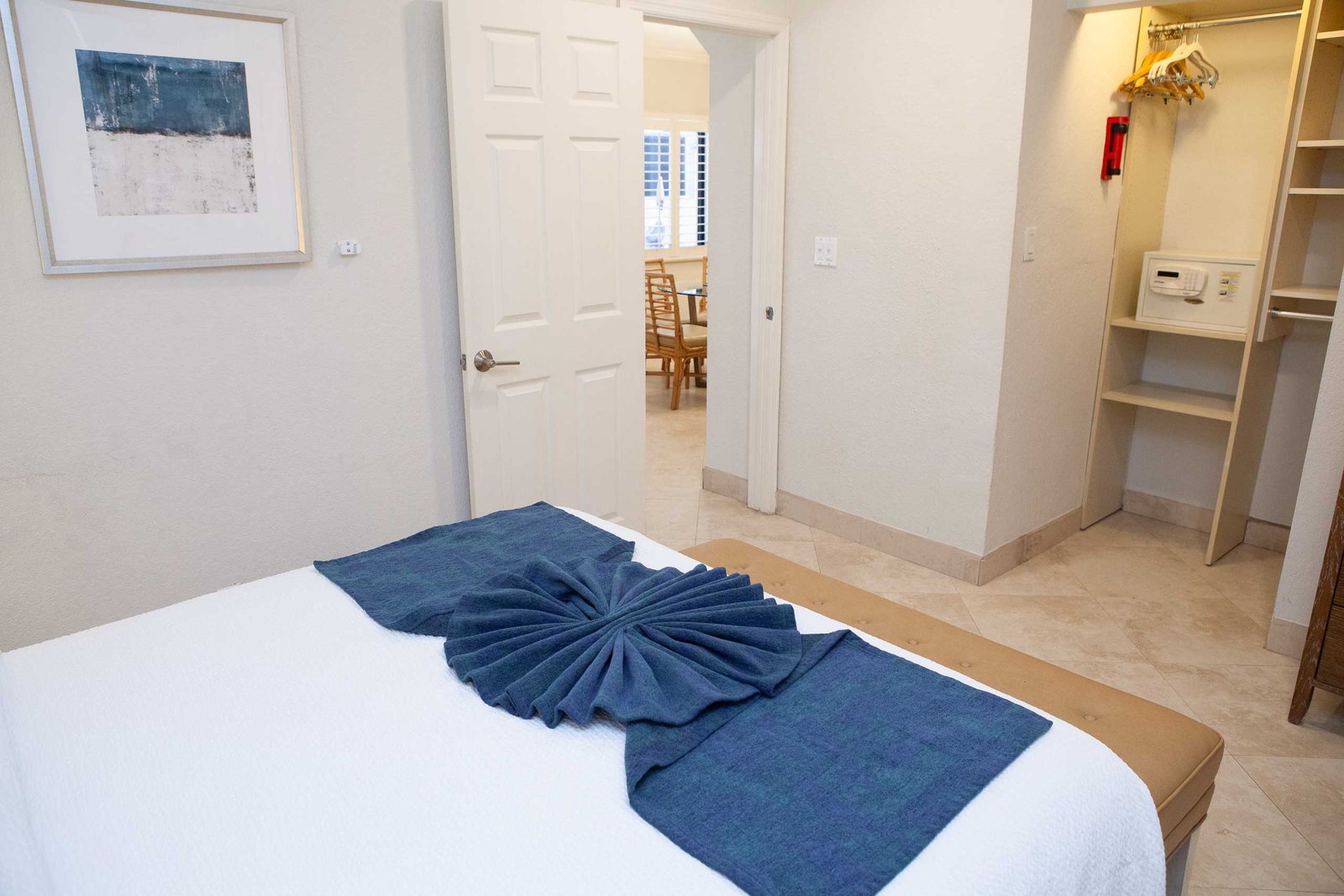 The other option is The Sea Foam Two-Bedroom Suites, which consist of a One-Bedroom Suite, connecting to a Hotel Room. There is a king bed in the bedroom with two Bahama beds* in the living room with an additional king bed in the Hotel Room. There is an additional king or queen bed in the Hotel room and a total of three full baths in this combination. Each sleeping area has its own flat screen TV as well as the living room, making this a great space for larger families or groups to share.
