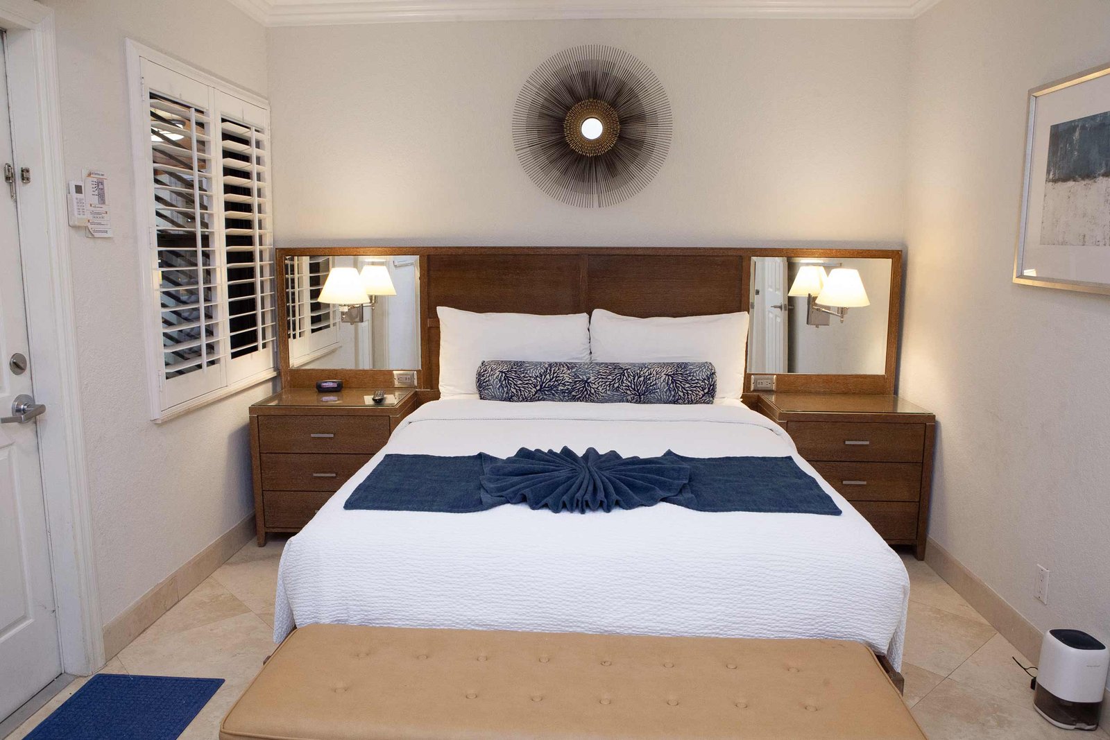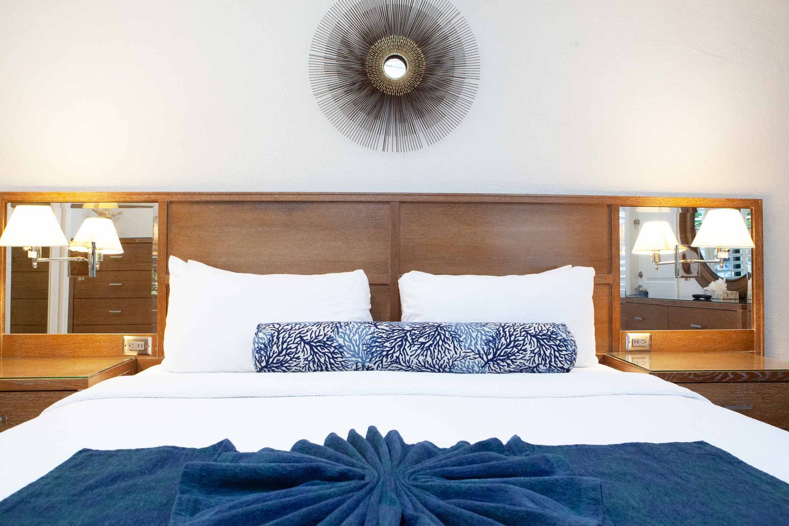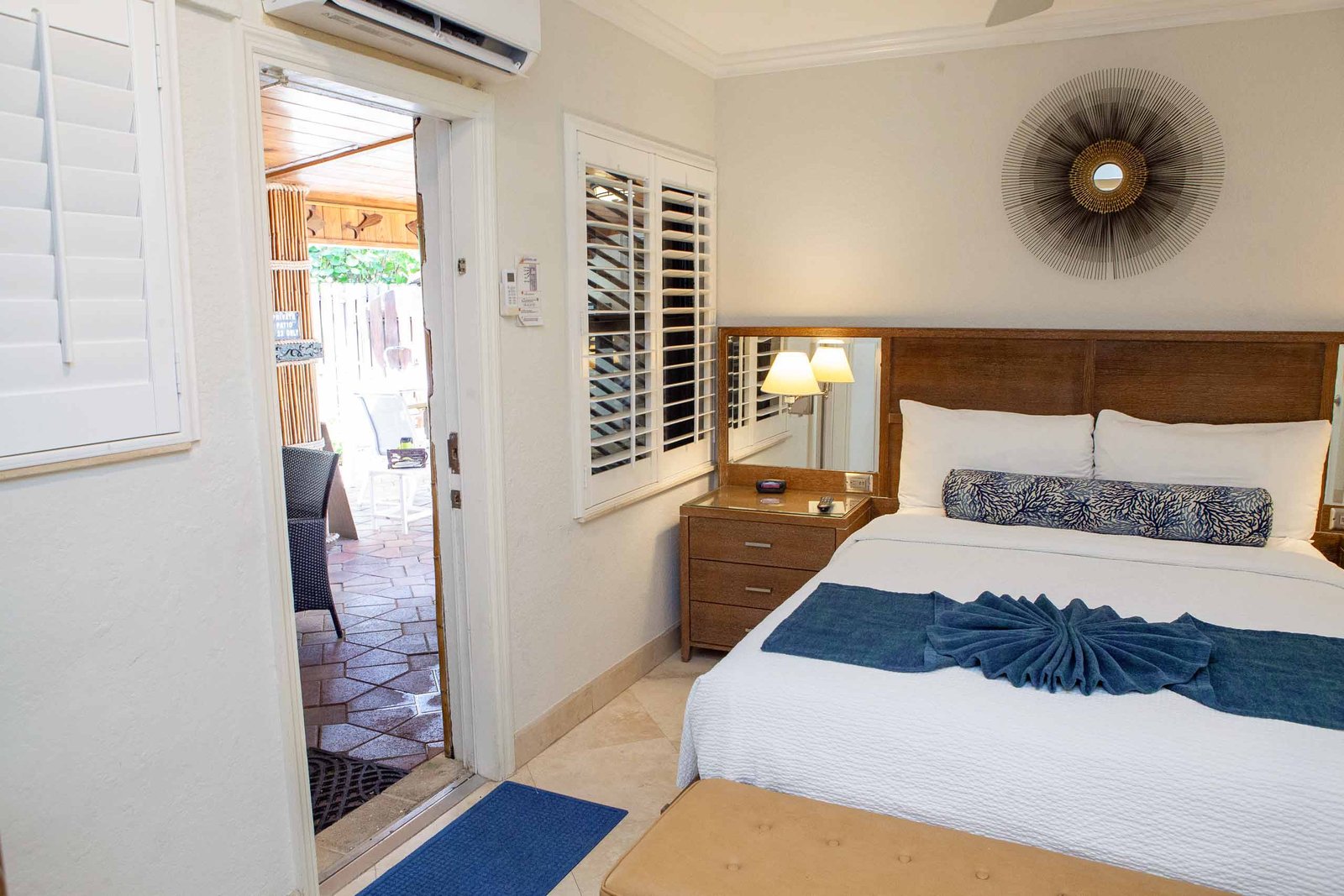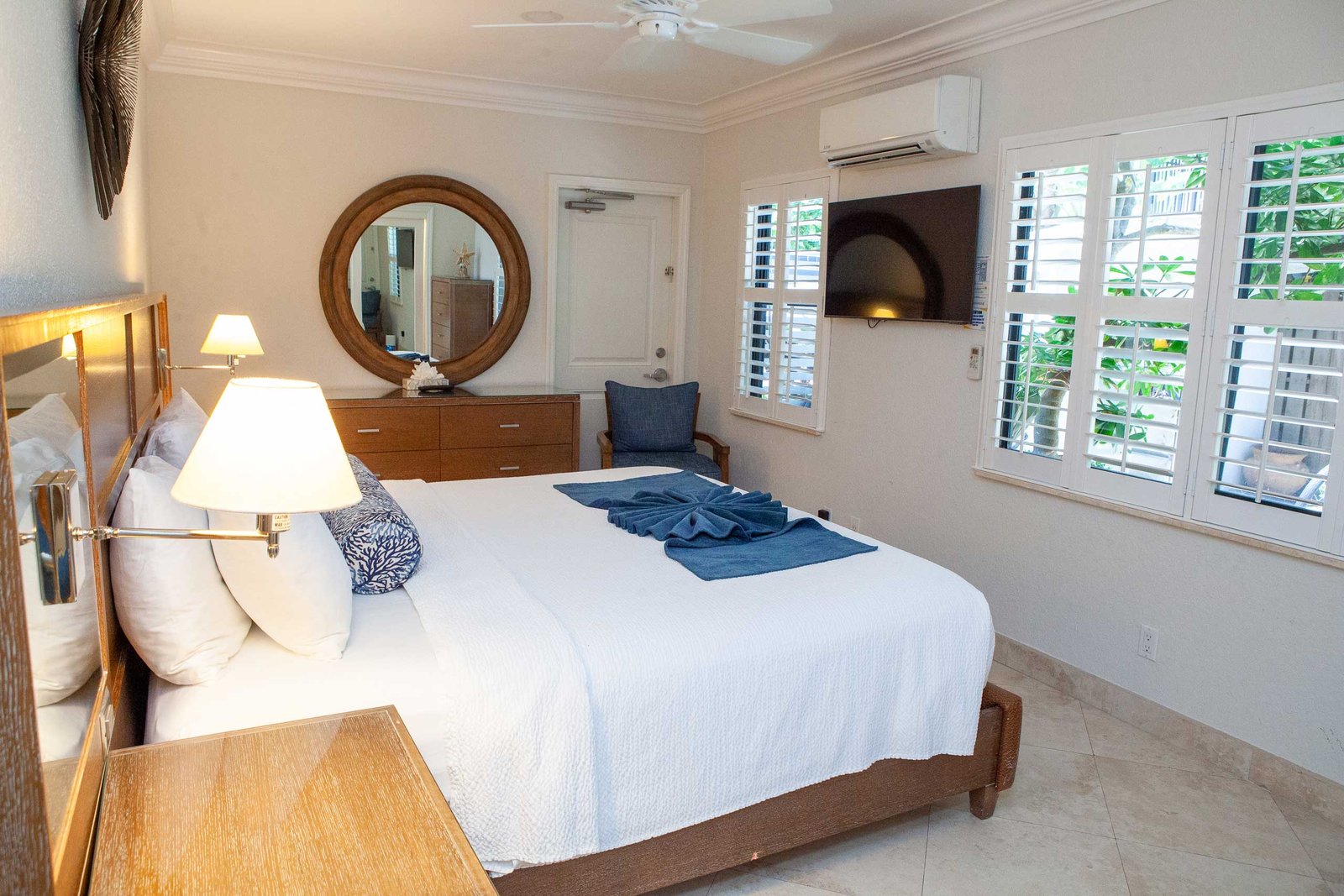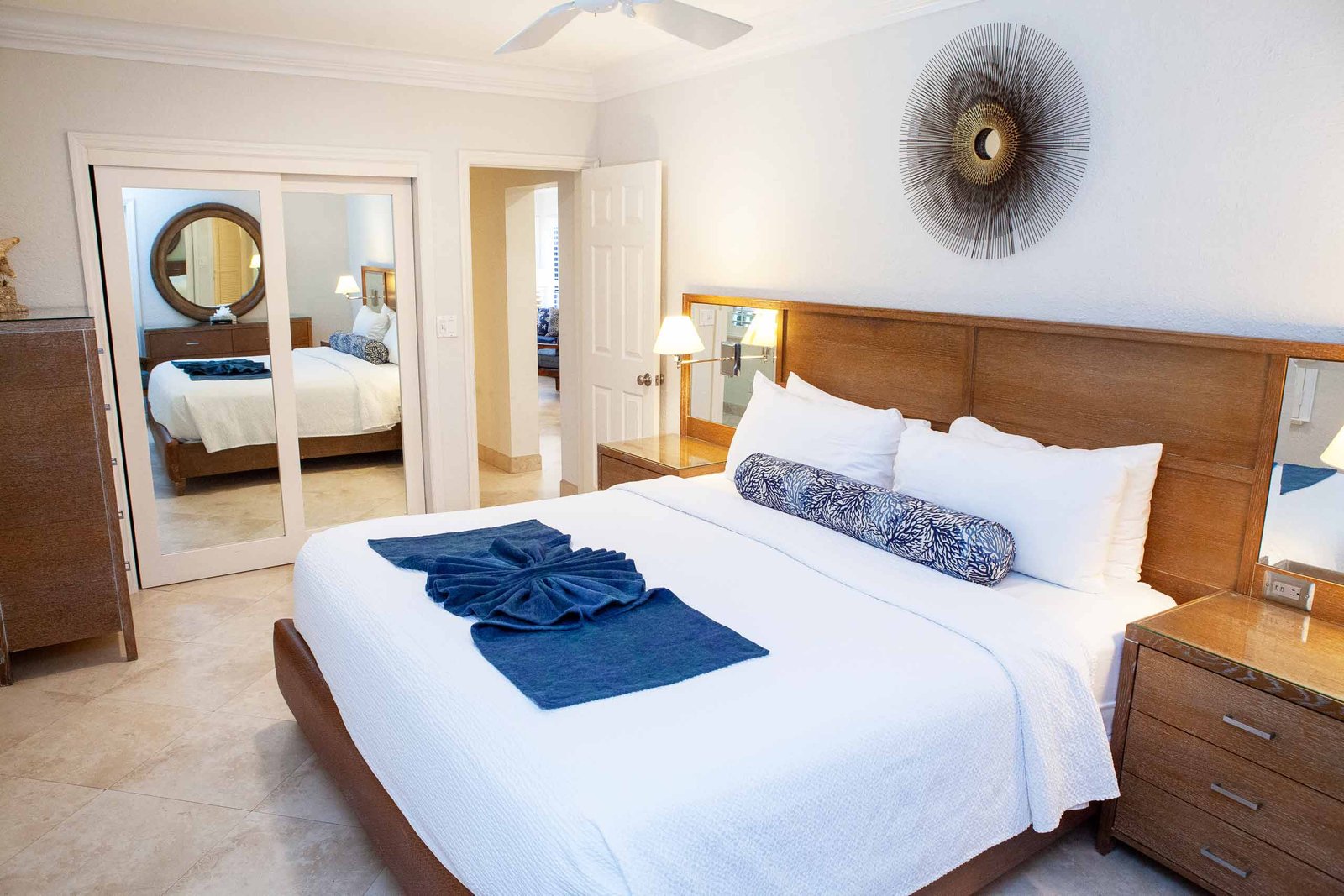 The other option is The Sea Foam Two-Bedroom Suites, which consist of a One-Bedroom Suite, connecting to a Hotel Room. There is a king bed in the bedroom with two Bahama beds* in the living room with an additional king bed in the Hotel Room. There is an additional king or queen bed in the Hotel room and a total of three full baths in this combination. Each sleeping area has its own flat screen TV as well as the living room, making this a great space for larger families or groups to share.
